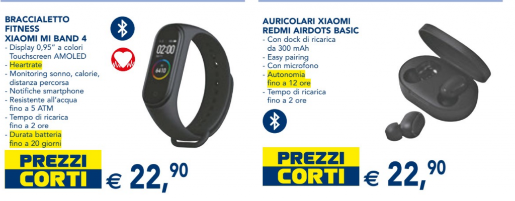 Ed è proprio su questi ultimi che ci vogliamo concentrare, perché ci sono due modelli di Xiaomi offerti a un prezzo particolarmente conveniente. Si tratta della Mi Band 4, un braccialetto fitness, e degli auricolari Bluetooth true wirelss Redmi Airdots Basic. Il volantino Esselunga propone entrambi i prodotti a 22,90 euro.