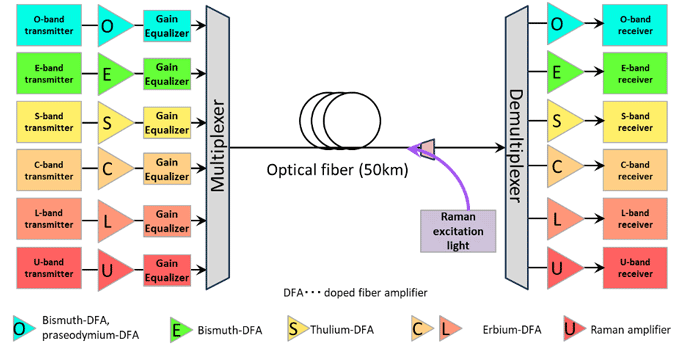 Il team di ricerca ha raggiunto questo obiettivo trasferendo dati su 50 chilometri di cavi in fibra ottica standard disponibili in commercio. Ma come hanno fatto a ottenere una tale velocità di trasferimento? Hanno utilizzato sei bande di trasmissione diverse, passando dalla superstrada all’autostrada, aumentando così la larghezza di banda a 37,6 terahertz (THz), un incremento del 35% rispetto al precedente test NICT.