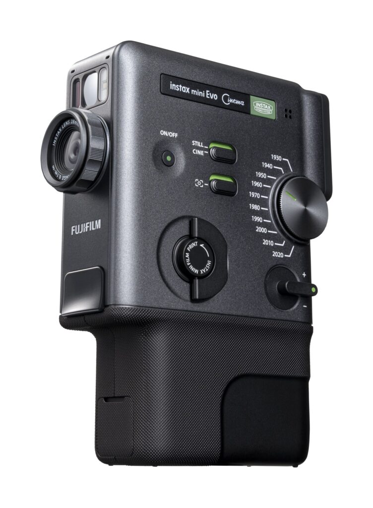 Accanto alla stampante, Fujifilm introduce la instax mini Evo Cinema, una fotocamera istantanea ibrida che combina acquisizione fotografica, ripresa video e stampa diretta. Il design richiama le cineprese 8 mm, con una scocca nera, dettagli verdi e un’impugnatura verticale ispirata alla FUJICA Single-8 del 1965.