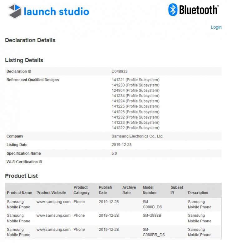 Ieri è infatti arrivata la certificazione Bluetooth, rilasciata per il modello SM-G988. Per essere ancora più precisi, il documento elenca tre modelli: SM-G988B_DS, SM-G988B e SM-G988BR_DS. Il dittongo “DS” indica un telefono Dual SIM.
