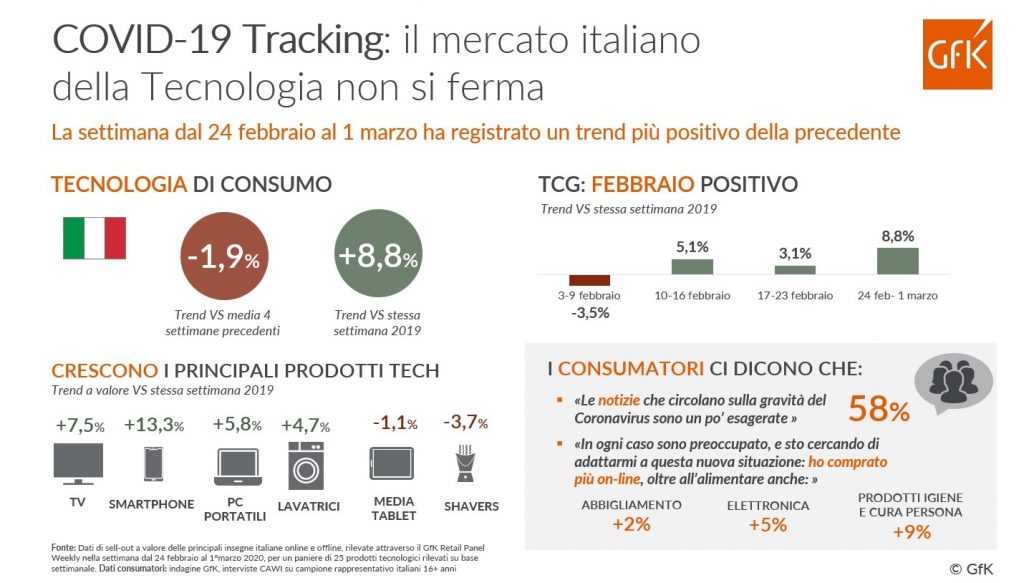 Guardando ai dati preliminari, GfK prevede un dato in crescita per il mese febbraio 2020, rispetto allo scorso anno. Per ora, quindi, i cambiamenti dei consumi legati al Coronavirus sembrano aver impattato solo parzialmente sul trend positivo che ha caratterizzato l’inizio del 2020 per il mercato italiano della Tecnologia di consumo.