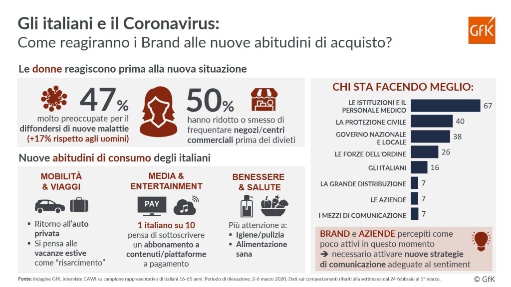 Il monitoraggio settimanale sui consumatori attivato da GfK fa registrare una preoccupazione crescente, soprattutto da parte delle donne. Si riduce la mobilità, a favore dell’utilizzo dell’auto privata e di un maggiore consumo di contenuti mediali. Cresce l’attenzione per la cura personale e l’alimentazione intesa come strumento di benessere. In questo contesto difficile, torna la fiducia negli esperti, mentre i brand sono percepiti come poco attivi.