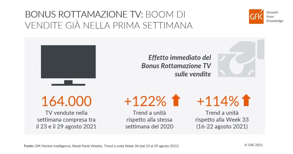 Secondo le rilevazioni GfK Market Intelligence questo incentivo ha avuto un effetto immediato sulle vendite: nella prima settimana di validità del Bonus TV – quella compresa tra il 23 e il 29 agosto 2021 – sono stati venduti oltre 164mila televisori, con una crescita pari al +122% a unità rispetto alla stessa settimana del 2020. Il trend è decisamente positivo anche se si confronta il dato della settimana analizzata (settimana 34) con la media delle settimane da inizio 2021: in questo caso la crescita è stata pari al +120%.