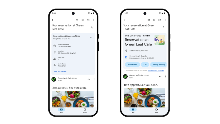 - Nuovo design delle schede riepilogative: Le email relative a acquisti, eventi, bollette e viaggi avranno un layout migliorato, con pulsanti di azione rapida. Sarà possibile aggiungere eventi al Calendario, impostare promemoria per pagamenti o inviare inviti con pochi clic.