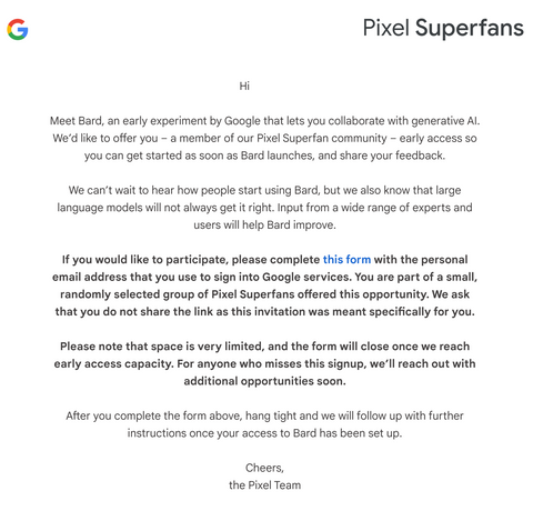 Infatti diversi utenti appartenenti al programma Pixel Superfan hanno ricevuto una mail in cui vengono rivelate diverse informazioni. In questa viene detto che i suddetti fanno parte di un numero limitato di persone, scelte casualmente, che avranno la possibilità di provare Bard non appena questo sarà disponibile.