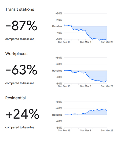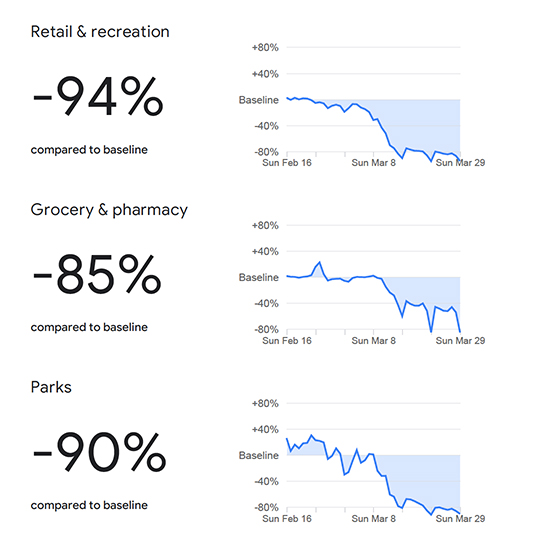 In Italia al 29 marzo l’affluenza a farmacie e alimentari è diminuita dell’85% (davvero strano a dirsi guardando le code interminabili fuori dalle farmacie), -i parchi sono rimasti deserti (-90%), 94% shopping center, bar e ristoranti segnano il -94% (sono praticamente chiusi), -87% i trasporti e -63% i luoghi di lavoro. Una cosa sola cresce del 24%: ovviamente la residenzialità.