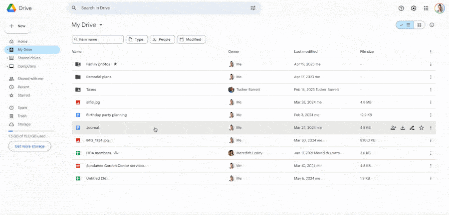 Con le hovercard, tutte le informazioni di un file sono accessibili senza bisogno di clic. Basta posizionare il cursore su di esso per visualizzare un’anteprima, permettendo di consultare rapidamente un lungo elenco di file senza dover navigare nella struttura ad albero del tuo Google Drive.