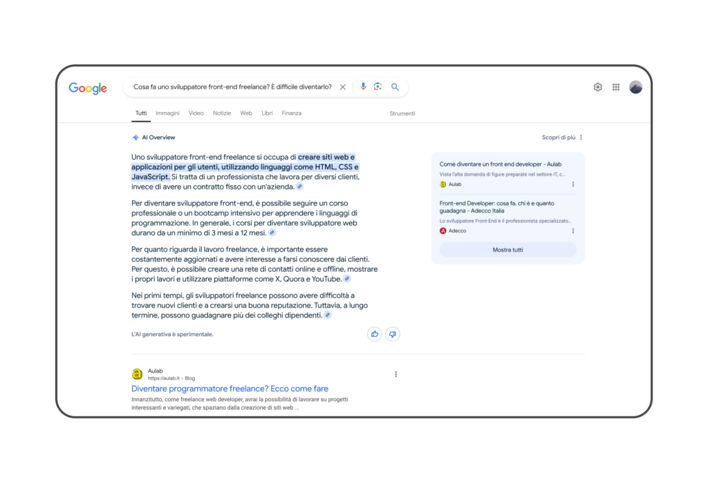Grazie alla nuova funzionalità della Ricerca Google – AI Overview – ora è più semplice per le persone fare domande elaborate, trovare le informazioni che cercano e scoprire siti web utili per rispondere ai loro bisogni.