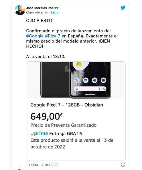 Lo youtuber spagnolo Jose Morales Ros – Geekdegafas su YouTube – ha condiviso un tweet accompagnato da un interessante screenshot catturato da Amazon secondo cui il lancio di Google Pixel 7 è confermato in Spagna e costerebbe circa 649 euro. Esattamente lo stesso prezzo del Pixel 6 dell’anno scorso.