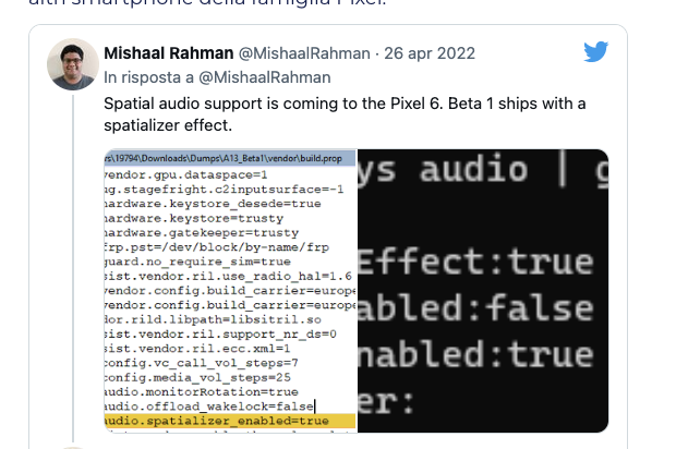Presentata con grande clamore l’anno scorso su iPhone, la tecnologia Spatial Audio di Apple consente alle cuffie compatibili di offrire un’esperienza sonora più coinvolgente, mettendoci al centro della canzone che stiamo ascoltando. Ora apprendiamo che Google sembra intenzionata a lanciare una funzionalità simile sul proprio Pixel 6. Questo è quanto è emerso dal contenuto di alcuni file scoperti da Mishaal Rahman (ex caporedattore del sito specializzato XDA Developers) nella prima beta di Android 13.