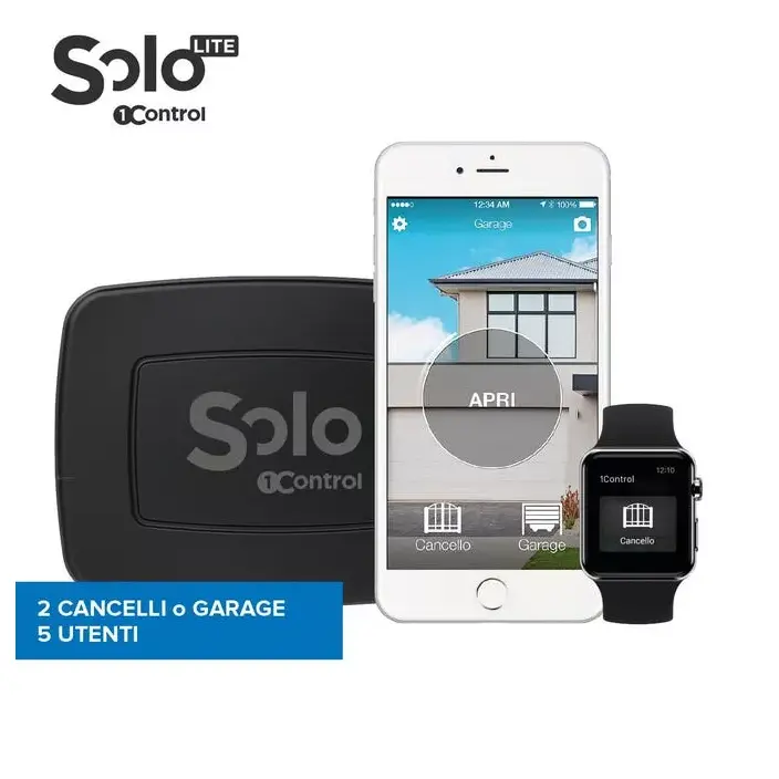 1Control Solo Lite è un dispositivo apricancello che trasforma lo smartphone in un telecomando universale. Il 1Control Solo Lite è l’ideale per chi cerca una soluzione semplice e versatile per la gestione dei propri accessi domestici. Con la capacità di controllare fino a 2 cancelli o garage e l’utilizzo fino a 5 utenti, questo dispositivo è perfetto per famiglie e piccoli uffici.