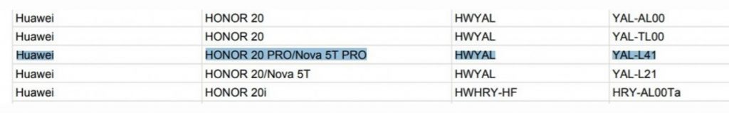 Il documento di Google che conferma la certificazione del telefono potrebbe aver “spoilerato” anche altri nomi che i dispositivi potrebbero avere su alcuni mercati. Nell’elenco delle certificazioni, infatti, si parla di “Honor 20 Pro/Nova 5T Pro” e di “Honor 20/Nova 5T“.