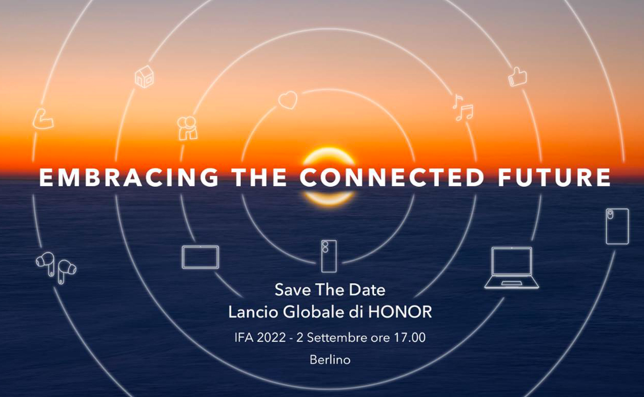HONOR è lieta di annunciare la sua partecipazione a IFA 2022, evento durante il quale verranno ufficialmente presentati nuovi e interessanti prodotti. La conferenza stampa si terrà il 2 settembre 2022, alle ore 17:00 (CET), sia di persona a Berlino che online attraverso un servizio di livestreaming.Speriamo possiate essere dei nostri per scoprire le nostre ultime innovazioni.