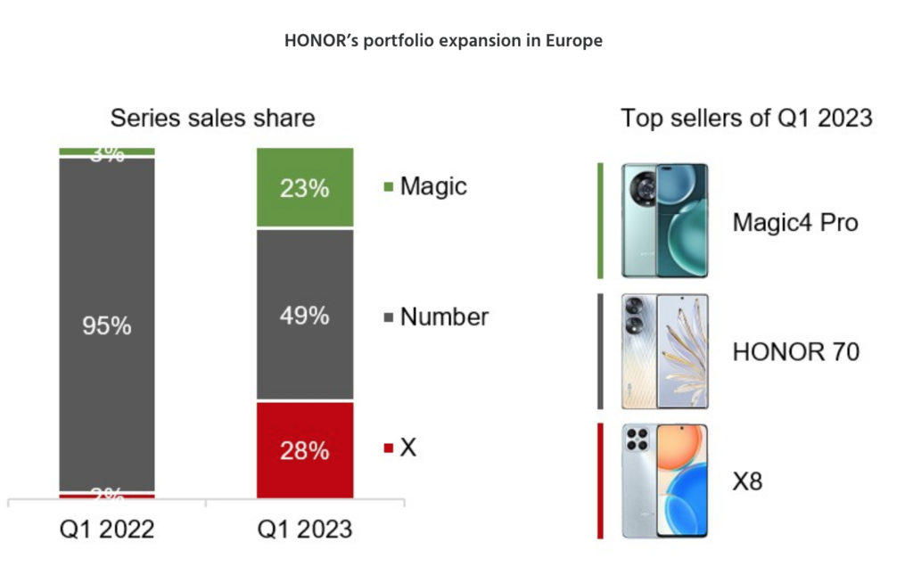 Eppure abbiamo dovuto attendere un po’ di tempo prima che HONOR tornasse in Europa dopo aver ottenuto l’indipendenza da Huawei nel 2020. Dopo un periodo di riorganizzazione, il produttore si è ripresentato con nuovi team a inizio 2022 stringendo partnership con alcuni dei più importanti rivenditori, con le principali insegne di elettronica di consumo e con i maggiori operatori mobili (tra cui 3 UK, Orange e SFR Francia e Wind3 Italia). Gli operatori, secondo Counterpoint, sono fondamentali per le prospettive di crescita future poiché i loro canali di vendita hanno rappresentato circa il 40% delle vendite europee di smartphone nel primo trimestre del 2023 (e circa il 55% in Europa occidentale).