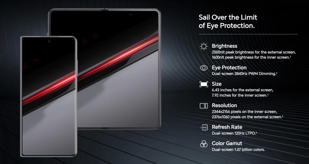 Cambia invece la livrea dello smartphone, che adotta lo stile e i colori del celebre marchio Porsche Design e che ricorda le vetture dell’iconica casa automobilistica tedesca. Il dispositivo ha uno spessore di 9,9 mm quando piegato e di 4,7 mm quando è aperto e pesa solo 234 grammim, meno di molti smartphone tradizionali. Lo schermo esterno è da 7,92 pollici, quello interno da 6,43 pollici.