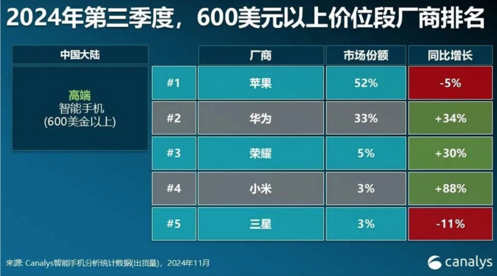 Huawei e Apple dominano il segmento degli smartphone premium in Cina per il terzo trimestre del 2024 ossia dei dispositivi venduti a un prezzo superiore ai 600 dollari.