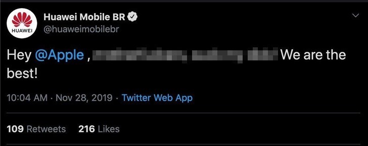 Dopo che i tweet sono stati rimossi, Huawei ha spiegato che il suo account Twitter brasiliano è stato violato ma l’hacker non sembrava necessariamente interessato a deridere Huawei quanto insultare la concorrenza.