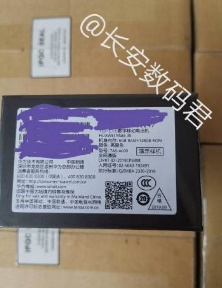 La confezione contiene il Mate 30 ed è destinata al mercato cinese. Il lato della scatola non fornisce troppe informazioni ma conferma l’esistenza della variante base con memoria da 6 GB / 128 GB.