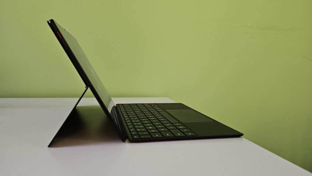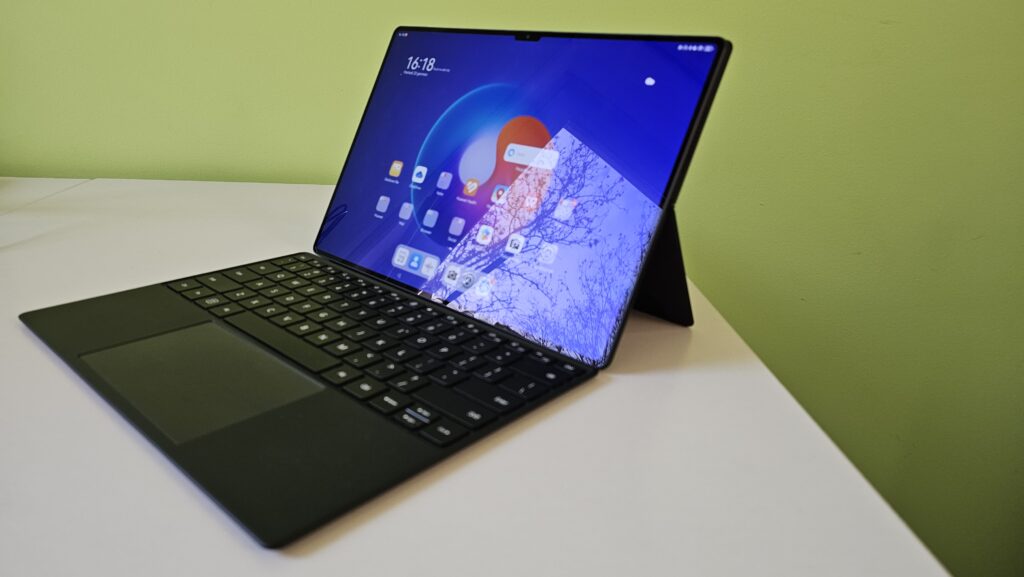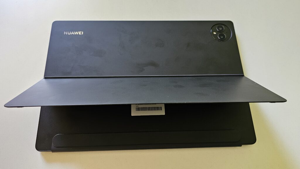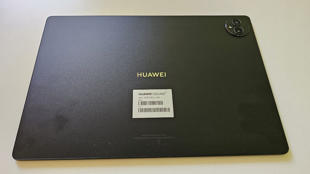 Huawei Matepad Pro 13.2 è assemblato in modo perfetto ed è costruito con materiali pregiati. La scocca fornisce la tipica sensazione di un dispositivo premium. Lo spessore di Matepad Pro 13.2 è ridotto a 5,5 millimetri e il suo peso arriva a soli 580 grammi, un risultato notevole, considerando le dimensioni complessive dell’oggetto. La superficie frontale appare piuttosto ampia e viene determinata dal grande display da 13,2 pollici. Il profilo inferiore posteriore, ospita una serie di contatti magnetici, ai quali si aggancia la tastiera, mentre nella parte superiore è presente il tasto per il controllo del volume. Il lato di sinistra lascia al pulsante rosso di accensione, mentre quello di destra ospita il connettore Usb Type-C. La scocca ospita anche sei speaker e i microfoni, utilizzabili, ad esempio, durante le video call. Il design della cover posteriore viene interrotto, dalla presenza di una doppia fotocamera da 13 + 8 (ultrawide) Megapixel, che torna utile per scansionare documenti o eseguire foto che presentano anche buon livello di qualità complessiva. Non manca anche un elemento frontale da 16 megapixel, che grazie anche alla tecnologia TOF, risulta particolarmente sicura nella scansione del volto, nelle operazioni che lo richiedano.