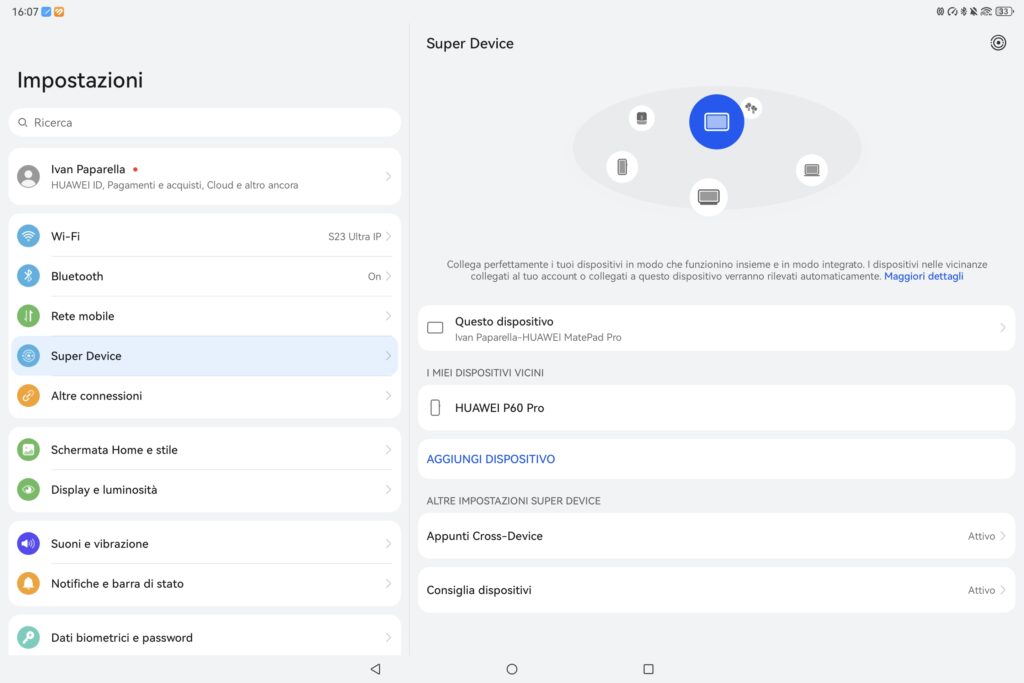 L’esperienza di utilizzo del nuovo Huawei Matepad Pro 13.2 è assai gratificante. Il produttore sta proseguendo la messa a punto del proprio sistema operativo Harmony OS, in questo caso in versione 4, e propone un software ricco di funzioni, molto stabile e altrettanto veloce. Si è vero, anche su questa macchina, non ci sono i servizi Google, ma le alternative sono tante e non è detto che la ricerca di soluzioni diverse, non porti addirittura a risultati migliori. Chi vi scrive, ne è convinto da tempo, il pacchetto di applicazioni di Microsoft (client email, browser, traduttore, cloud, etc…) si integra, ad esempio, alla perfezione su questo dispositivo. Harmony OS di Huawei è inoltre dotato anche di alcune chicche, come uno splendido sistema di navigazione GPS (Petal maps) ma anche di un comodissimo editor video. Importante anche citare Super Device, un applicativo che consente di far dialogare in tempo reale, periferiche Huawei, condividendo con facilità contenuti e file di ogni tipo. Noi l’abbiamo utilizzato in abbinata a un Matebook Pro e a un Huawei P60 Pro. Tutto funziona bene e il sistema è sostenuto da un reparto Hardware ben dimensionato.