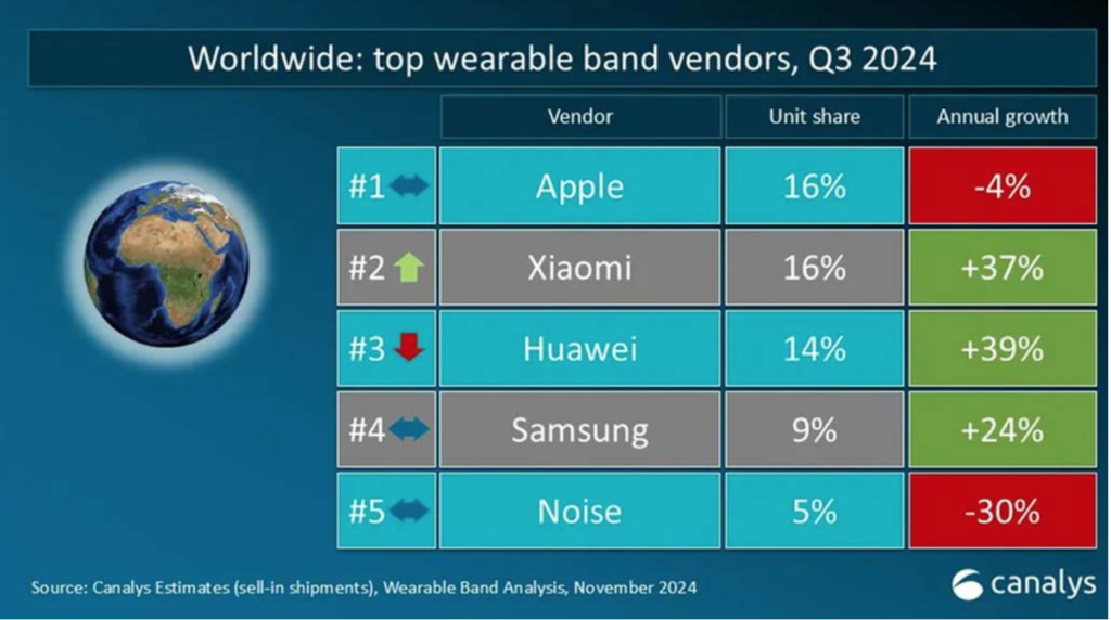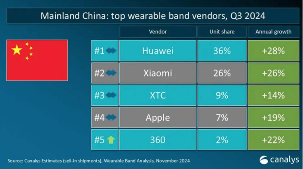In China, Huawei ha ottenuto il 36% del mercato, emergendo con il più alto tasso di crescita annuale. Con un incremento del 28% anno su anno, grazie all’introduzione di smartwatch di successo, il produttore di Shenzhen ha dimostrato di saper sostentere un’offerta sempre più innovativa per i propri consumatori. Xiaomi occupa la seconda posizione con una quota di mercato del 26%, mentre XTC e Apple si classificano rispettivamente al terzo e quarto posto. 360 Group si posiziona quinto, con il 2% del mercato e un incremento annuale del 22%.