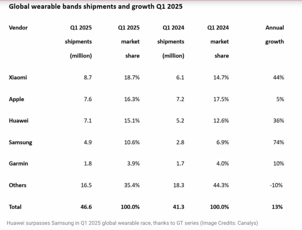 Il primo trimestre del 2025 si chiude con una sorpresa nel mercato globale dei dispositivi wearable: Huawei conquista la terza posizione nella classifica mondiale, secondo il più recente report pubblicato da Canalys. L’azienda cinese ha registrato una crescita impressionante del 36% anno su anno, raggiungendo quota 7,1 milioni di unità spedite e detenendo una quota di mercato del 15,1%.