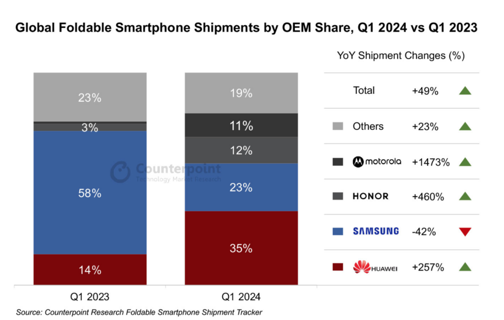 Secondo il nuovo Counterpoint Research Foldable Smartphone Shipment Tracker il mercato globale degli smartphone pieghevoli è cresciuto del 49% su base annua nel primo trimestre del 2024, segnando il tasso di crescita più alto in sei trimestri.