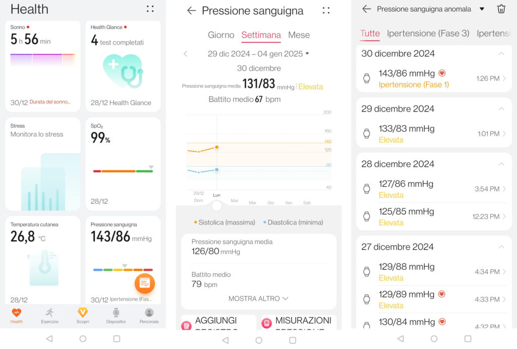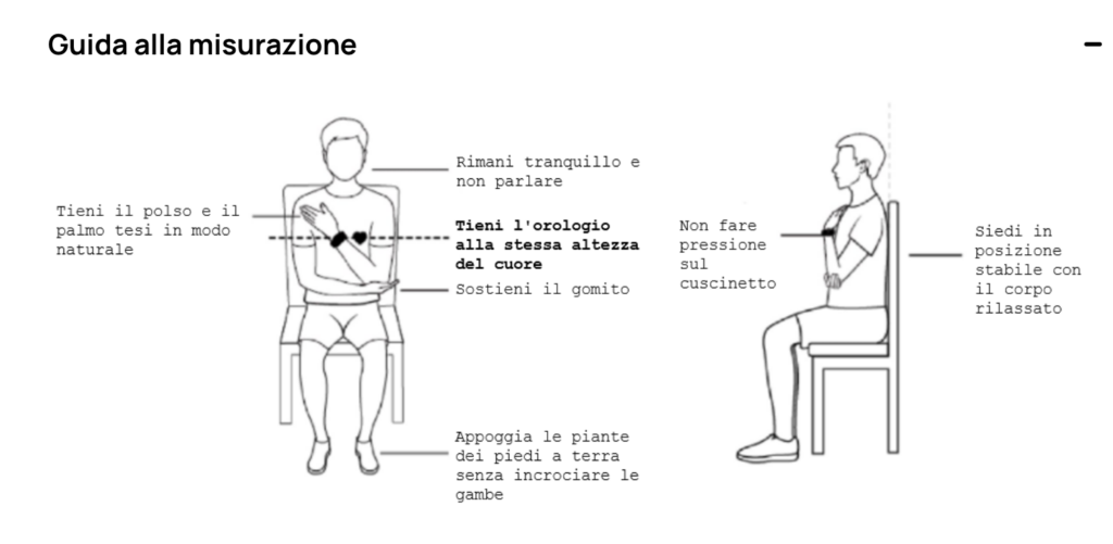 Come con il classico misuratore da polso, è necessario sempre registrare tre letture e calcolarne la media per assicurarsi di ottenere una lettura che possa essere considerata accurata. Inoltre, per provare la pressione, Huawei suggerisce di sedersi comodamente, di evitare di parlare, di tenere i piedi saldamente al suolo, di non incrociare le gambe e di tenere il palmo della mano che indossa l’orologio aperto e appoggiato al petto, in linea con il cuore.