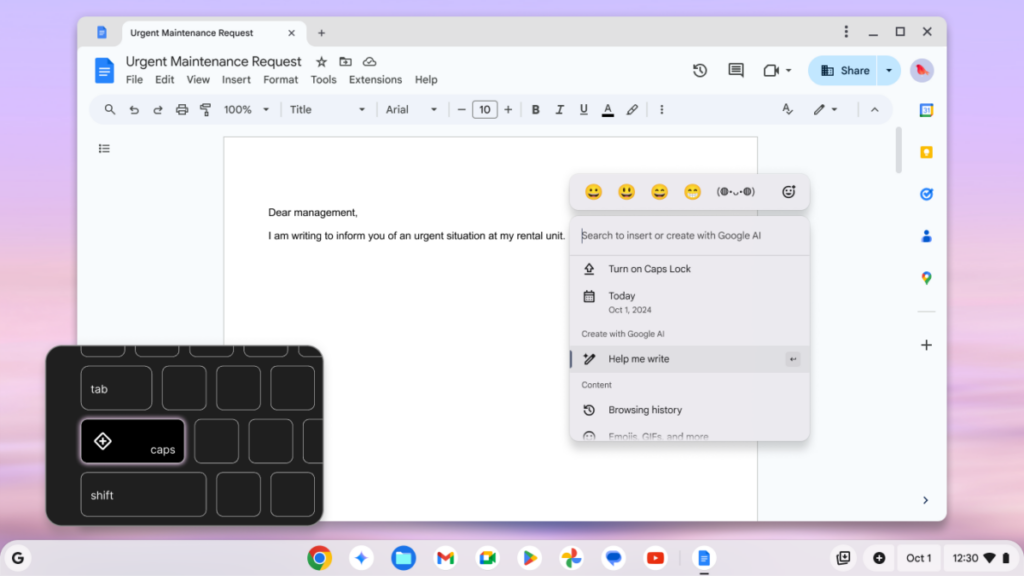 La grande novità è l’introduzione del pulsante “Quick Insert”, che fa il suo debutto sul Samsung Galaxy Chromebook Plus. Sebbene possa essere paragonato al pulsante Windows Copilot, offre maggiori funzionalità. Questo tasto permette di riscrivere testi, cercare file su Google Drive, convertire unità o accedere rapidamente ai siti visitati di recente.