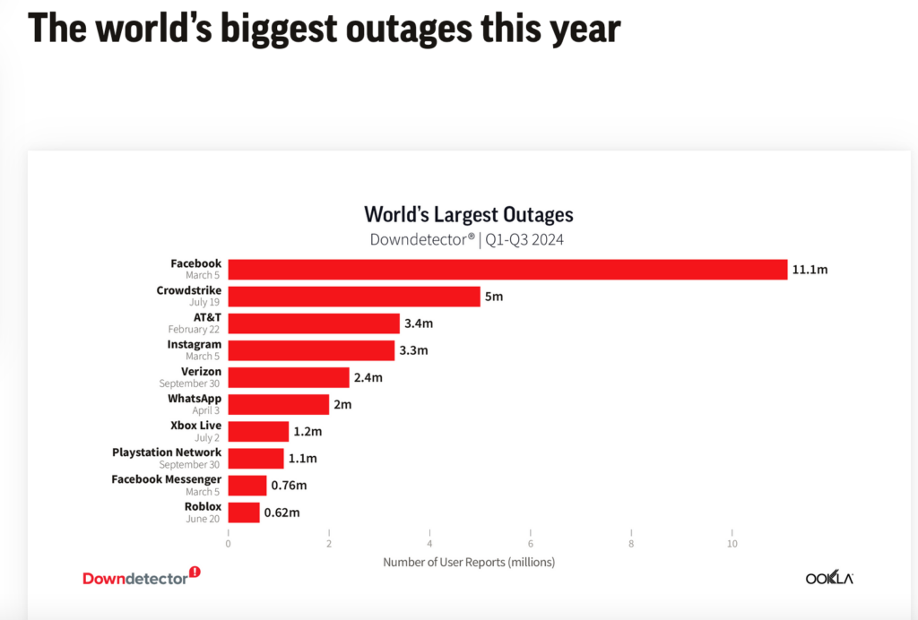 E il 2024 ha visto molte interruzioni che ci hanno ricordato quanto una di queste situazioni possa sconvolgere la vita quotidiana di milioni di persone. Abbiamo analizzato i dati di Downdetector (il portale che monitora le prestazioni in tempo reale di migliaia di servizi web in tutto il mondo) dal primo al terzo trimestre del 2024 per vedere dove si sono verificati i maggiori “down” e quali servizi hanno colpito maggiormente.