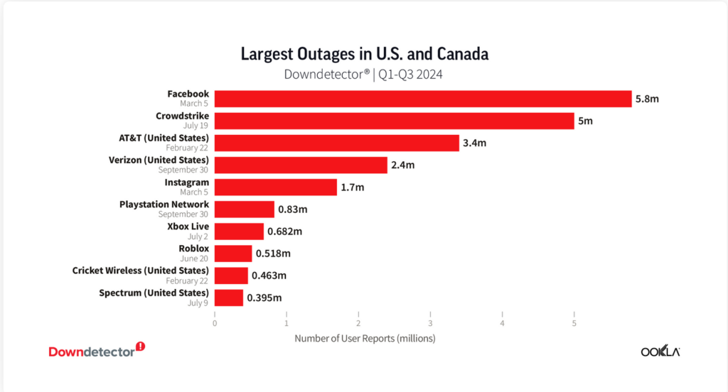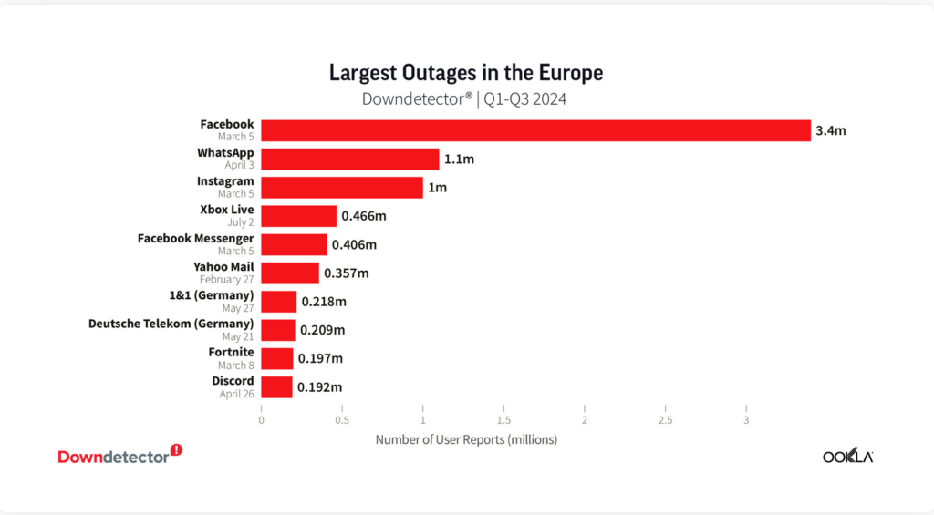 I siti di social media sono stati la principale fonte di problemi in Europa secondo i dati di Downdetector. Oltre 3,4 milioni di utenti europei hanno segnalato problemi a Facebook durante l’interruzione del 5 marzo: si tratta dell’interruzione più grande avvenuta in Europa durante i primi tre trimestri del 2024.