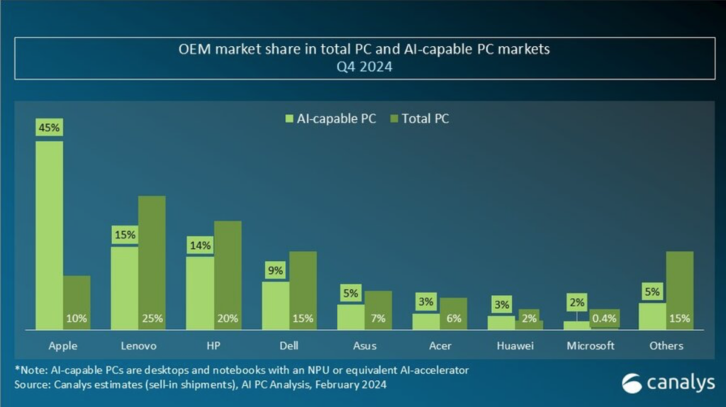 “Apple ha chiuso in bellezza il Q4/2024, superando i primi tre vendor e raggiungendo una quota del 10,2% nel mercato totale dei PC e una quota del 45% nel mercato dei PC con capacità AI”, ha concluso Jessop.