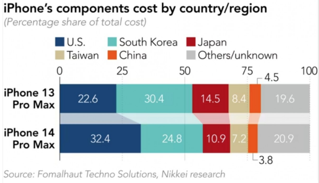 I componenti per i dispositivi iPhone 14 di società con sede negli Stati Uniti rappresentano quasi un terzo del costo totale e sono in aumento del 10% rispetto al 2021. La Corea del Sud è il secondo fornitore di componenti mentre la quota della Cina si è ulteriormente ridotta di recente, poiché Apple ha da tempo deciso di limitare la sua dipendenza dal mercato asiatico.