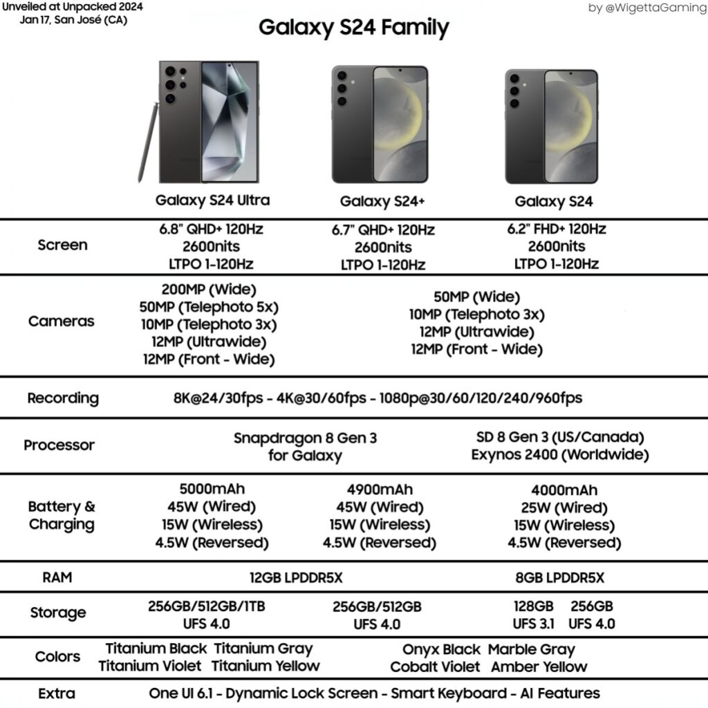 Con riguardo ai prezzi, il Galaxy S24 e S24+ potrebbero essere un po’ più economici rispetto al listino di lancio dell’S23 (circa 50 euro in meno), mentre il prezzo del modello Ultra dovrebbe più o meno mantenersi simile a quello dell’S23 Ultra uscito nel 2023.
