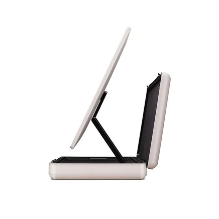 Una volta aperta la valigia, appare subito una schermata. Tirandolo leggermente, si apre da un braccio molto rigido, piuttosto rassicurante, e si posiziona appena sopra la valigia. Lo schermo può essere orientato verticalmente o orizzontalmente. Sotto c’è un telecomando nascosto.
