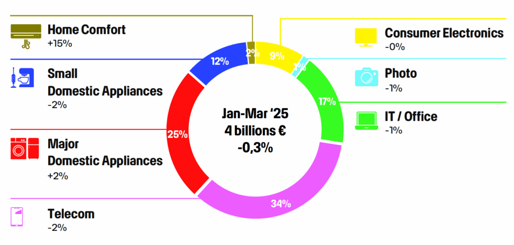 Il mercato dei prodotti “tech durable” è tornato a crescere a livello globale, con un fatturato, nel primo trimestre del 2025, di 196,2 miliardi di euro, +2,3% rispetto allo stesso periodo del 2024 (Fonte GfK). Il 45% della torta è formata dal segmento Telecom, seguito dai grandi elettrodomestici (18%).