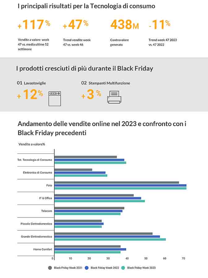 Per questo perimetro di prodotti, durante la settimana del Black Friday 2023 è stato generato un controvalore pari a 438 milioni di euro.
