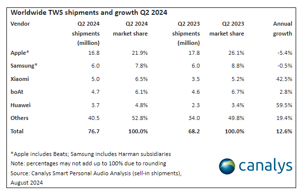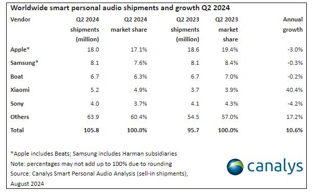 L’ultima indagine Canalys rivela la tendenza dei dispositivi audio intelligenti, aumentato globalmente del 10,6% nel secondo trimestre del 2024, anche grazie alle performance degli auricolari open-form. La ricerca comprende anche dispositivi TWS, auricolari wireless e cablati. In totale sono state spedite ben 106 milioni di unità. L’aumento è stato del 10,5% anno su anno, per il numero più alto di spedizioni nel secondo trimestre di sempre. I dispositivi TWS hanno registrato quota 77 milioni di spedizioni, con una quota di mercato del 72,6% e una crescita annuale del 12,6%. Le cuffie wireless hanno segnato quota 15 milioni di unità spedite. I dati positivi nonostante il rallentamento del segmento TWS lo si deve ad una democratizzazione del prezzo dei device, spesso al di sotto dei 50 dollari, anche dei principali fornitori.