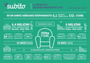 Secondo l’Istituto Svedese di Ricerca Ambientale (IVL), nel 2016 gli 8 milioni di utenti di Subito hanno risparmiato 6,1 milioni di tonnellate di CO2 (+77% in più rispetto al 2015), una quantità equivalente a tutto il traffico di Roma per 18 mesi o a quello di Milano per 42 mesi, a 6,4 milioni di voli andata/ritorno Milano-New York o 6 milioni Roma-New York, alla produzione di 101,5 milioni di iPhone 5S o 23 milioni di laptop, di 28 milioni di passeggini o 24 tonnellate di divani, 182,8 milioni di paia di jeans, di 1.000.000 di Volkswagen Golf, di 88,5 milioni di bicicletta, di 9,4 miliardi di tonnellate di pasta o 1,3 miliardi di kg di riso.