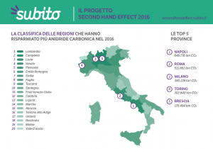 Subito ha calcolato anche in quali regioni e province siano state risparmiate più tonnellate di anidride carbonica, partendo da dove sia stato venduto il maggior numero degli oltre 18 milioni di oggetti usati scambiati nel 2016 in tutta Italia. Delle 20 regioni italiane, la più virtuosa si è rivelata essere la Lombardia: questa regione ha contribuito con il 16% del totale di CO2 risparmiata in tutta Italia. Anche la Campania si è posizionata ai vertici della classifica nazionale, un secondo posto raggiunto con un minimo scarto (15,1%) in particolare, grazie alla compravendita di veicoli. Segue il Lazio, più distante al terzo posto (10,3%), mentre a chiudere la top 5 della classifica nazionale troviamo il Veneto e il Piemonte, due regioni che hanno risparmiato rispettivamente il 9,2% e il 7,5% di anidride carbonica. Insieme le prime cinque regioni hanno permesso un risparmio del 58,2% (41,5% solo le prime tre) dei 6,1 milioni di tonnellate di anidride carbonica.