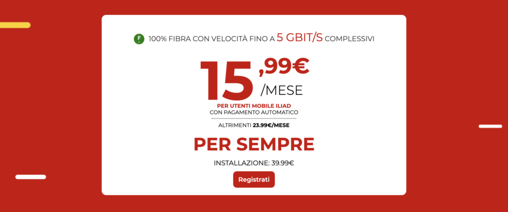 - Prezzo di 15,99€/mese per gli utenti con SIM mobile dell’operatore