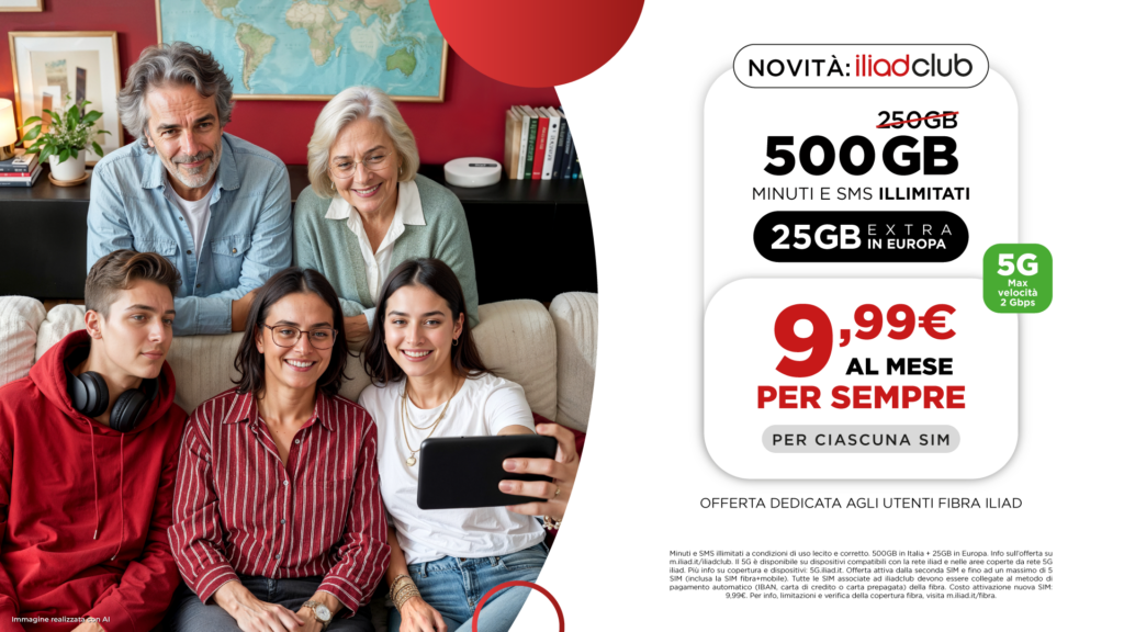 L’operatore continua a puntare sul tema della community, elemento che negli anni ha contribuito alla crescita del brand in Italia. Secondo i dati dichiarati, il tasso di soddisfazione degli utenti resta superiore al 97%. Con iliadclub, il vantaggio passa ai clienti che decidono di collegare più SIM sotto lo stesso “club”, composto da un minimo di due e un massimo di cinque utenze.