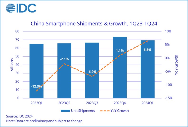 Il mercato cinese degli smartphone è cresciuto del 6,5% nel primo trimestre del 2024 grazie alla forte domanda di dispositivi Huawei e Honor.