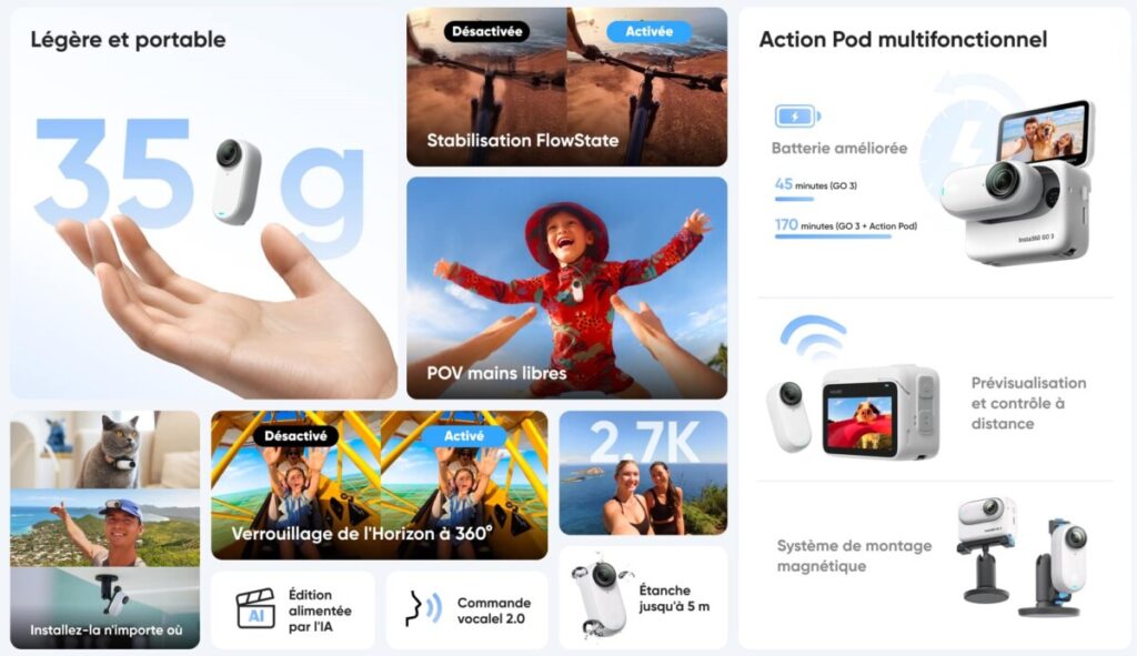 Come suggerisce il nome, la Go 3 succede alla Insta360 Go 2 lanciata a marzo 2021. È, come il modello precedente, una piccola action camera che ha il vantaggio della compattezza e della modularità. Concretamente, come quello che DJI ha potuto offrire con la sua Action 2, abbiamo così diritto a un modulo fotocamera distinto dal modulo schermo. È quindi possibile fissare la fotocamera in modo molto semplice e leggero, oppure avere un modulo più grande, con schermo e batteria, in cui si aggancia la fotocamera.