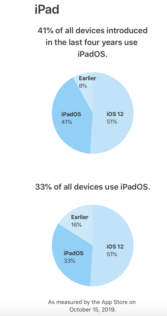 Da quando Apple ha deciso di creare un sistema operativo separato per i dispositivi iPad, l’azienda ha anche fornito statistiche per il suo sistema operativo iPadOS 13, che funziona già sul 41% di tutti i dispositivi introdotti negli ultimi quattro anni, nonché sul 33% di tutti i dispositivi.