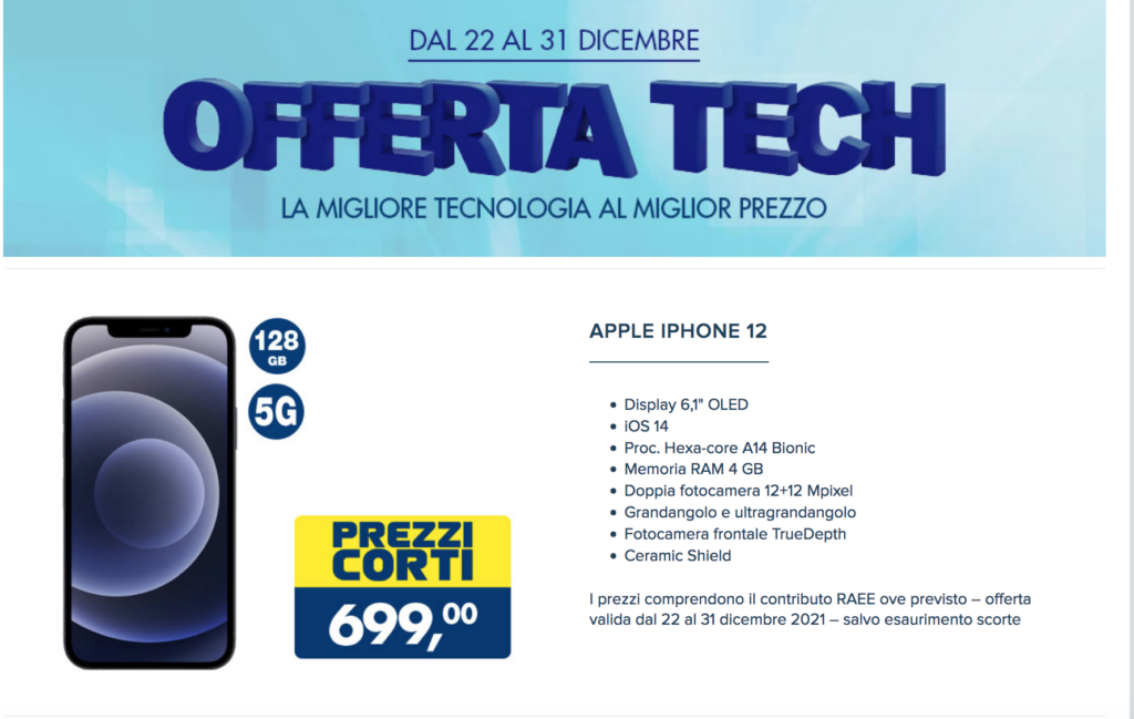 La nuova offerta tech del voltantino Esselunga, propone infatti iPhone 12, nella sue versione con memoria da 128 GB, al prezzo di 699 euro.