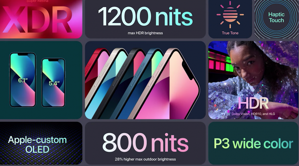 iPhone 13 e iPhone 13 mini sono stati ridisegnati all’interno e all’esterno e sono caratterizzati da un design a bordo piatto con cornice in alluminio. I display da 6,1 pollici e 5,4 pollici sono dotati di Ceramic Shield sulla parte anteriore. I display OLED Super Retina XDR offrono, secondo Apple. un aumento del 28% della luminosità massima all’aperto a 800 nit, con una luminosità di picco più elevata per contenuti HDR come foto e video a 1200 nits, il tutto pur essendo più efficiente dal punto di vista energetico.