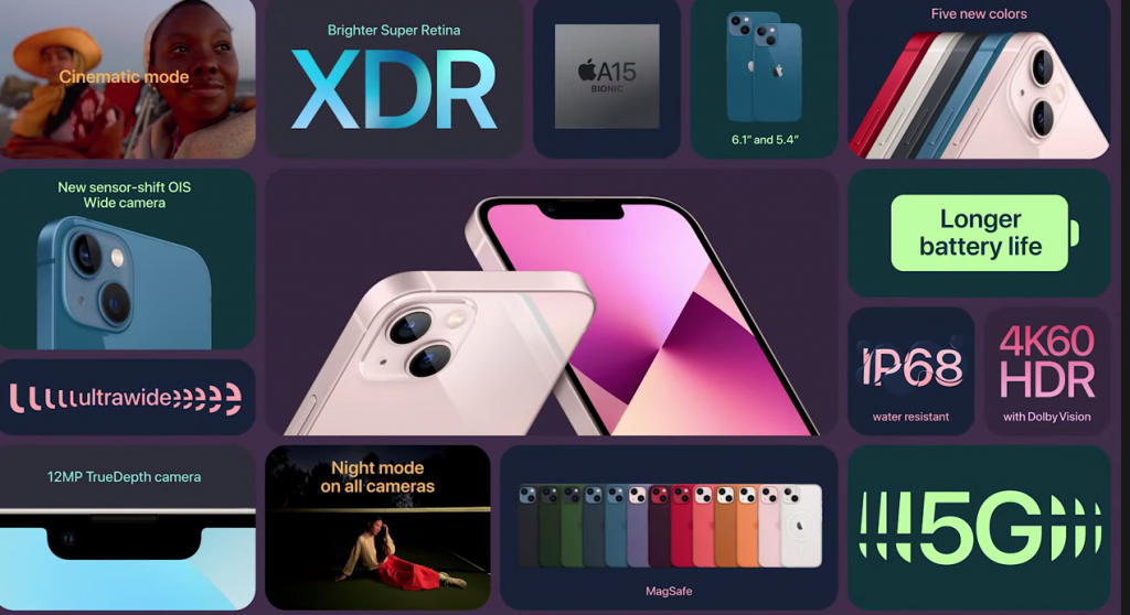 iPhone 13 e iPhone 13 mini portano in dote il nuovo chip proprietario A15 Bionic, una maggiore durata della batteria, un display Super Retina XDR più luminoso, 128 GB di memoria e la classificazione IP68 oltre naturalmente al 5G.