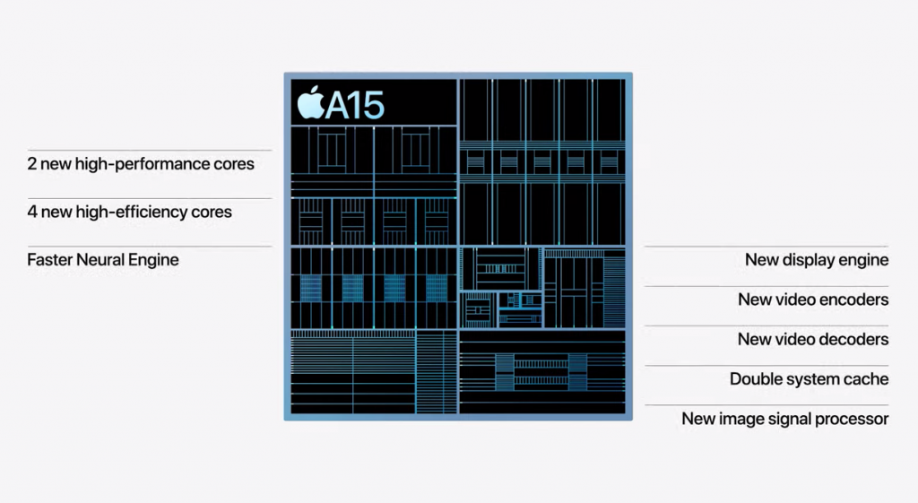 Come da tradizione sui nuovi modelli debutta anche il processore proprietario A15 Bionic, che Apple assicura sia molto più veloce della concorrenza, offrendo maggiori prestazioni e una migliore efficienza energetica.