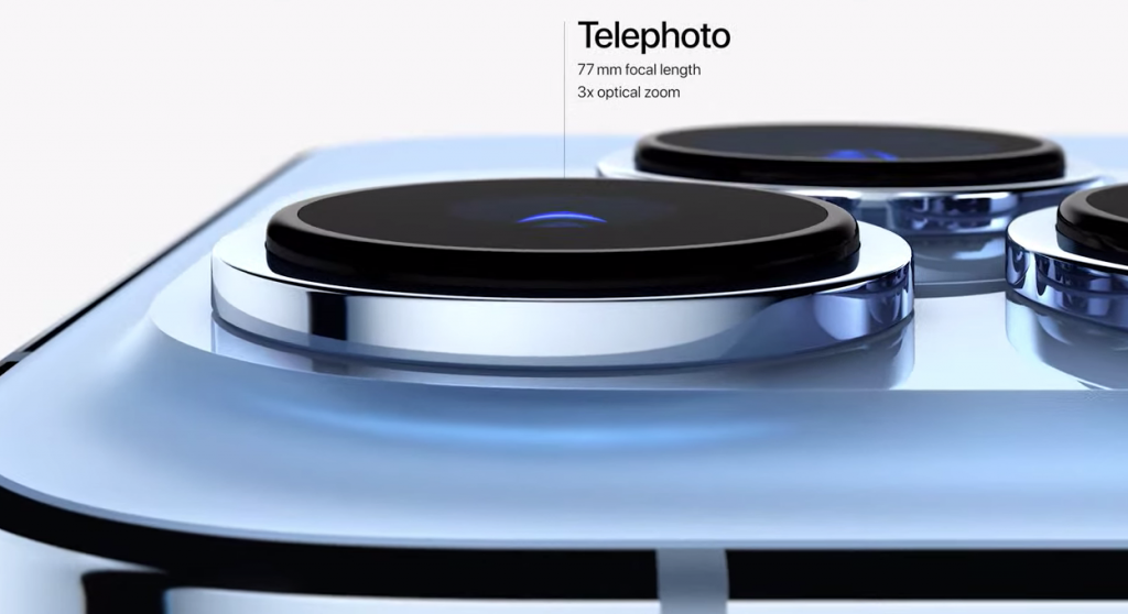 iPhone 13 Pro e iPhone 13 Pro Max vantano anche una nuova fotocamera con teleobiettivo da 77 mm, che consente agli utenti di avvicinarsi ai propri soggetti durante la registrazione di video e ottenere ritratti con cornice ancora più classica, offrendo uno zoom ottico 3x per una gamma di zoom ottico totale 6x sulla fotocamera sistema.